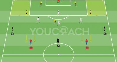 Parteispiel zur Verbesserung des Ballbesitzes in begrenzten Bereichen durch Überzahlsituation und DreickesbildungTaktik