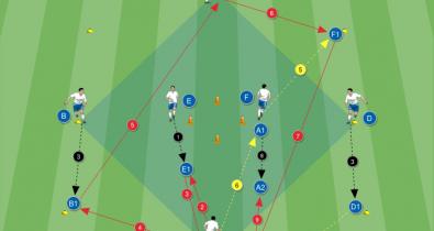 Übung mit einer Abfolge von Pässen, bei der ich darauf achte, wen ich sehe, und mit Positionswechseln zum richtigen ZeitpunktTaktik