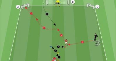Übung zum Abschluss nach Flanken oder Querpässen mit Wahl des Angriffs in den Raum wo der Ball gelangtSeiten