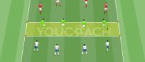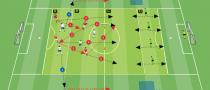 Vereinfachtes 3 gegen 2 Spiel zum Trainieren des Ballbesitzes, des Freilaufens während des Ballbesitzes und dem Umschalten. |