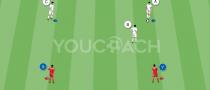 - Die roten Spieler in Ballbesitz müssen so schnell wie möglich den Mitspieler im 2. Quadrat erreichen, um die Überzahl im Ballbereich wiederherzustellen und den Ballbesitz mit dem gleichen Ziel neu zu beginnen.