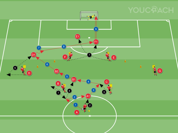 Am Ende jeder Aktion kehren die Spieler zu ihrem Ausgangspunkt zurück und sind bereit, die Übung erneut zu beginnen. Die nächste Aktion findet auf der gegenüberliegenden Seite statt, wobei B und C die gerade ausgeführten Aufgaben tauschen und G die Angreifer abschließt.