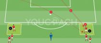 - Nach einen Abschluss oder Ausball beginnt jede neue Aktion mit einem Ball der vom Trainer neu eingeworfen wird und zwar mit einem Pass auf einer der beiden neutralen Spielern an den Seotenauslinien. Wichtig viele Bälle bereit zu halten.