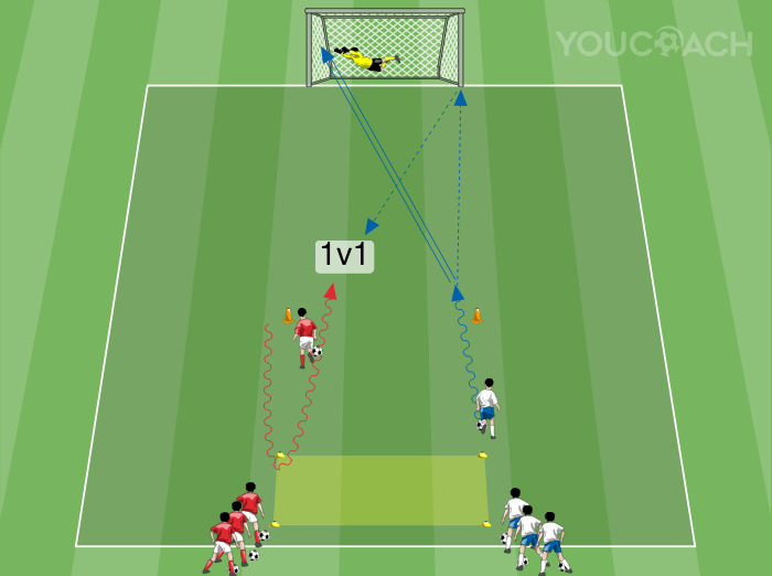 - Den Stürmer, der 1 gegen 1 spielt, dazu anregen, den Gegner mit Tempo anzugehen