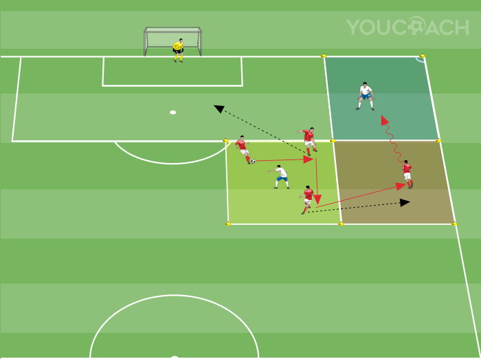 - Die drei roten Stürmer im ersten Quadrat spielen 3 gegen 1 gegen den weißen Verteidiger.