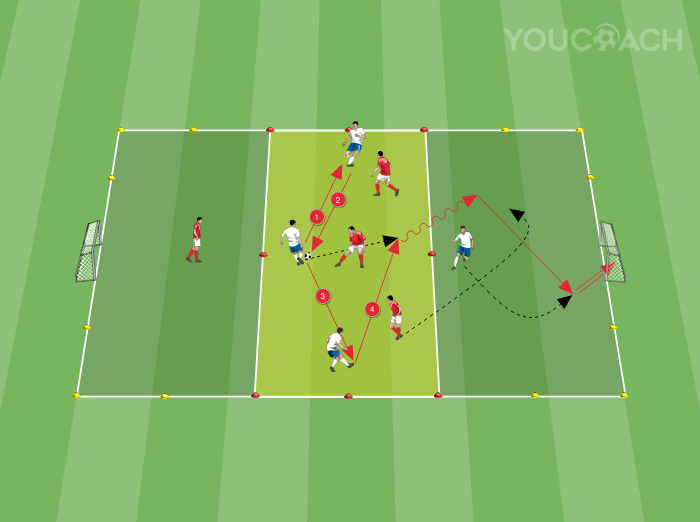 - Es entsteht eine 2-gegen-1-Situation, in der der Spieler, der den Ball über die Linie des mittleren Rechtecks bringt, seinem Mitspieler (Stürmer) hilft, ein Tor zu erzielen, während der dem Geschehen am nächsten stehende Spieler der gegnerischen Mannschaft das Tor verteidigt.
