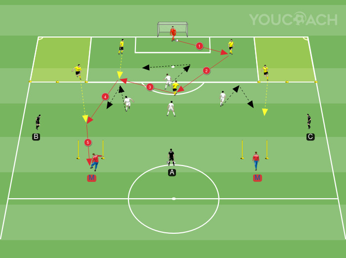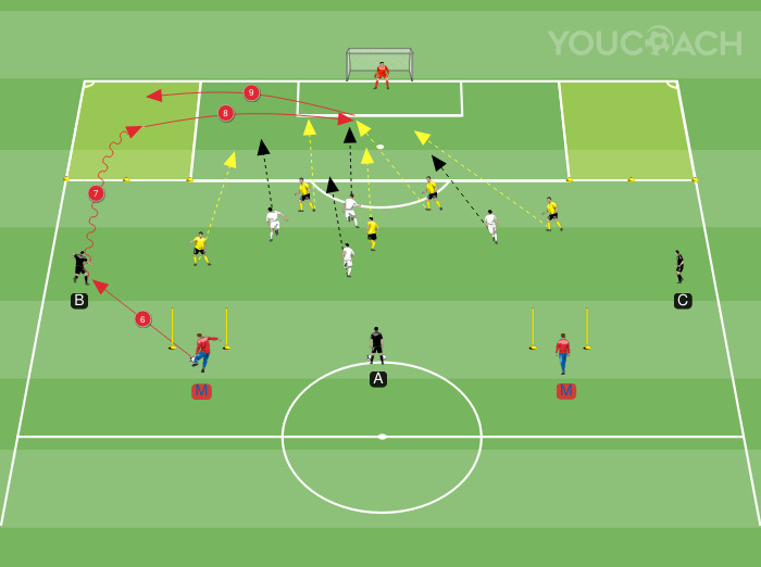 - Der Trainer (M) , der den Ball erhalten hat, spielt ihn auf dem Flügel in Richtung des Flügelspielers auf seiner Seite weiter (auf dem Bild gibt der Trainer (M) den Ball an den Flügelspieler B weiter), der den Ball in die „Flankenzone“ führt, um eine Flanke in den Strafraum zu schlagen. Die gelbe Mannschaft muss sich so schnell wie möglich zurückziehen, um ein Tor der weißen Mannschaft zu verhindern.