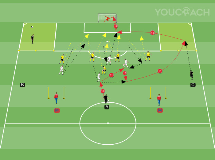 - Wenn die Aktion beendet ist, gibt Mittelfeldspieler A den Ball schnell an die weiße Mannschaft weiter, die in einer zweiten Aktion versuchen muss, den Ball zu dem Flügelstürmer zu bringen, der vorher nicht mitgespielt hat (Spieler C). Wenn der Flügelstürmer den Ball erhält, führt er den Ball und Flankt für den Torangriff der weißen Mannschaft, wobei die gelben Verteidiger das Tor verhindern müssen.