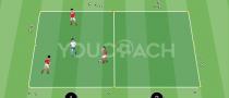 Der Torwart gibt den Ball an einen Spieler ab, der im Zentrum einer hypothetischen gegnerischen Mannschaft steht und den Ball an einen Spieler auf der Seite weitergibt. Von diesem Moment an führt der Spieler, der den Ball gepasst hat, eine diagonale Bewegung aus, um in Richtung des Torwarts zu spielen. Die anderen drei Spieler bewegen sich, indem sie die verbleibenden freien Räume besetzen und so die Dreiecke des Ballbesitzes wiederherstellen.