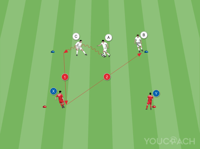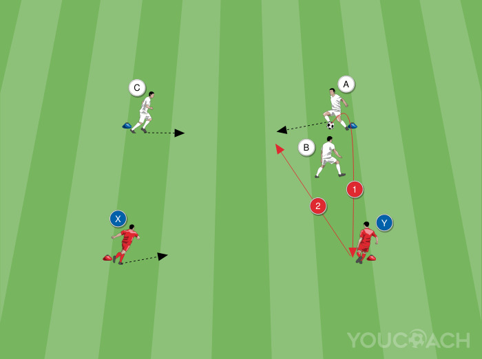 - Wenn Spieler Y, der den Ball erhalten hat, muss einen „Doppelpass“ mit A spielen und den Ball mit dem ersten Kontakt zurückspielen (mit dem Kopf oder Fuß).