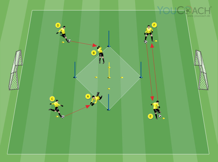 - Die beiden Torhüter (A, B auf dem Bild) müssen innerhalb der vier „Stangen“ die von den anderen Torhütern getretenen Bälle durch Fangen und Hechten angreifen.