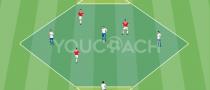 - Die vier Außenspieler spielen das Rondo mit maximal zwei Berührungen (Kontrolle und Weiterleitung). Pässe mit den Füßen können flach oder auf halbhoch gespielt werden.