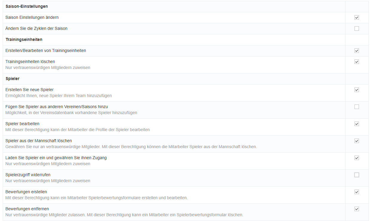 Die Berechtigungen sind für jede YouCoachApp Funktion anpassbar von Bearbeiten bis Anzeigen