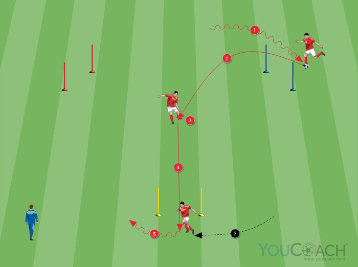 - Em algum momento, o treinador chama uma cor (por exemplo, "Azul") e o jogador com a bola deve conduzi-la rapidamente até o portão e lançá-la para o jogador no meio