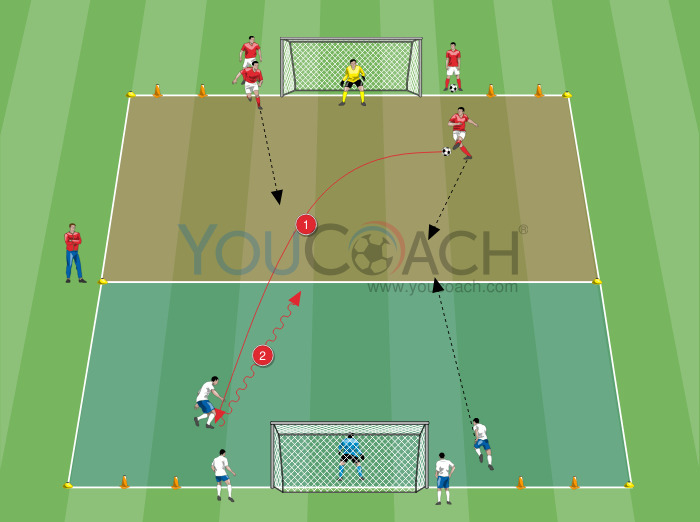 - Os jogadores vermelhos partem em um pique para enfrentar o par em posse da bola, criando uma situação de 2 contra 2 com alvo variável