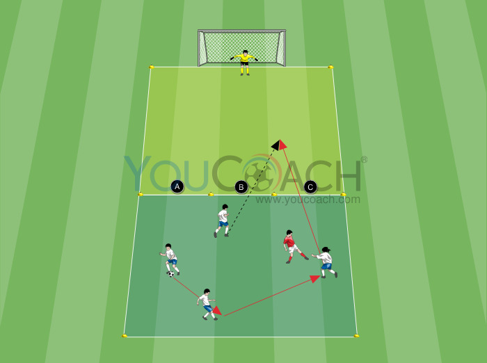 Crie dois quadrados adjacentes medindo 13x13 jardas a partir da linha de gol. No quadrado mais distante do gol, coloque cinco jogadores com uma bola para jogar um rondo 4 (branco na imagem) v 1 (vermelho). A área correspondente ao quadrado adjacente ao gol permanece livre, exceto pela presença de um goleiro para defender o gol. Para dividir os dois quadrados, coloque quatro marcadores, dividindo assim a linha que separa as duas zonas em três espaços iguais: corredor esquerdo (A), corredor central (B) e corredor direito (C). Cada corredor tem 4 jardas de largura.