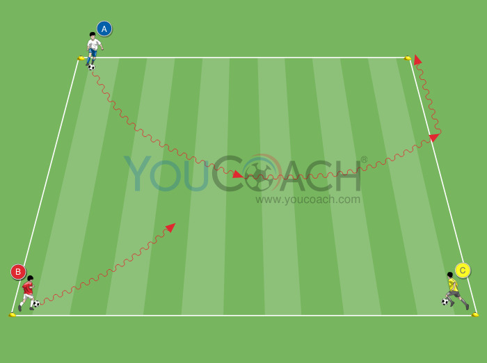 - Ao sinal do treinador, os jogadores A, B e C começam simultaneamente de suas posições e conduzem a bola em direção ao centro do quadrado