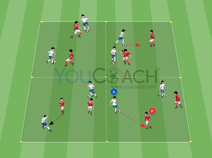 Forme uma área de jogo de 20x30 metros e divida-a em quatro áreas iguais. Em cada área, coloque quatro jogadores: dois atacantes com a bola e dois defensores (vermelhos) que exercem uma leve pressão sobre a bola.