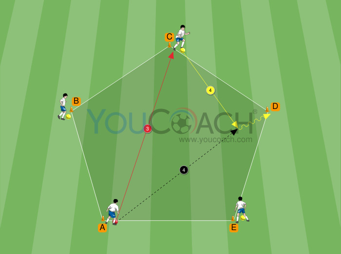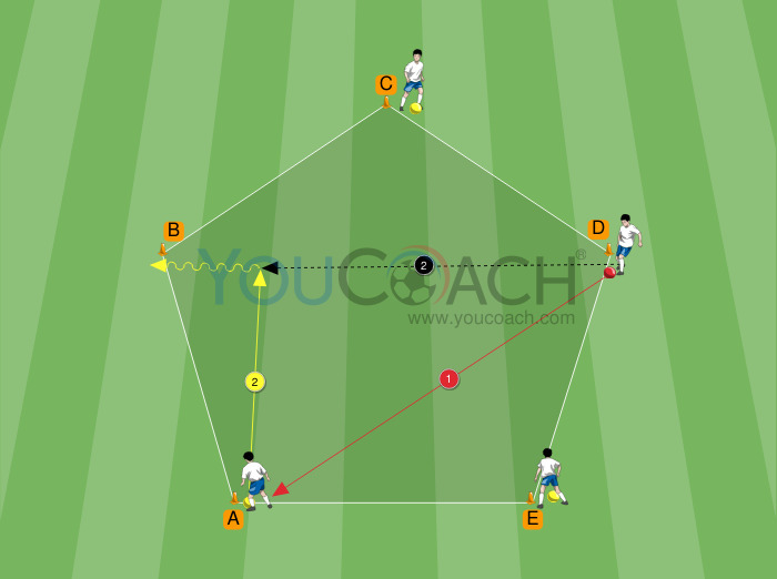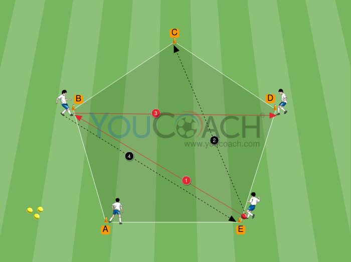 Usando cones, forme um pentágono com lados de 8-10 metros. Os cones são marcados com letras de A a E. Quatro jogadores vão para o lado de quatro cones; um cone está livre (C na imagem). Apenas um jogador começa com a bola (E). As outras bolas serão usadas nas últimas três séries. O jogador com a bola tem que ter um companheiro de equipe à direita e um à esquerda.