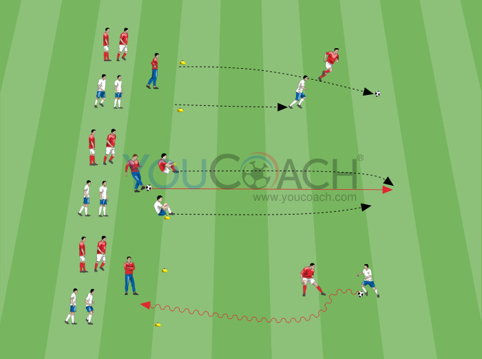 Divida a equipa em três grupos. Cada grupo tem duas filas de jogadores com coletes de cores diferentes (branco e vermelho na imagem). Coloque cada fila de jogadores ao lado de um marcador, cada marcador a 5 metros de distância do outro. Este exercício é realizado em pares: três pares trabalham simultaneamente. As filas estão numa linha imaginária, como mostrado na imagem. Mantenha algumas bolas de futebol ao lado de cada grupo. Cada par trabalha com uma bola.