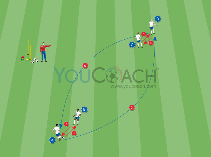 Numa área de jogo de 20x20 metros, coloque os jogadores em pares, um jogador de frente para o outro, como mostrado na imagem. Cada par está a 20 metros de distância um do outro. Dê uma bola a um jogador (A na imagem).
