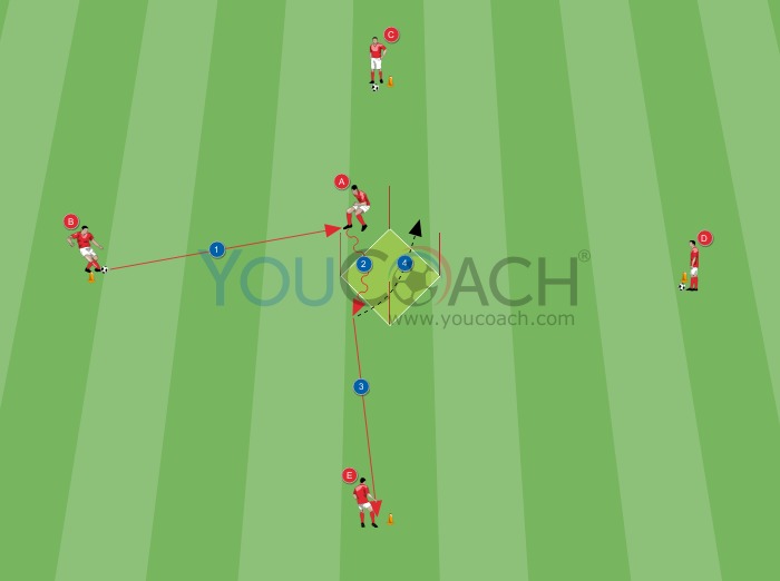 - O jogador A começa no quadrado e move-se para receber a bola de B
