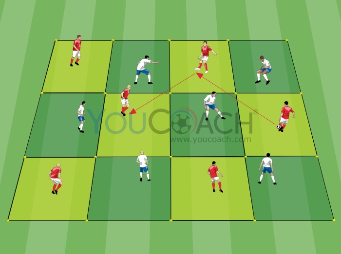 Posse de bola 6 vs 6 com cada jogador ocupando um espaço delimitado |