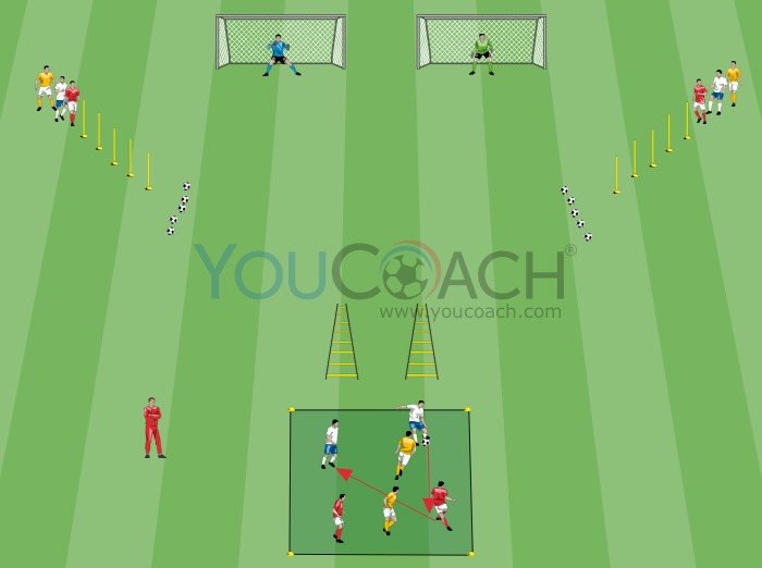 Coloque dois golos, lado a lado, ambos virados para o centro do campo como na imagem. Eles estão a 10 metros de distância um do outro. A cerca de 25 metros dos golos, coloque duas escadas de agilidade, cada uma virada para um golo, como na imagem; nas áreas laterais, diagonalmente, crie dois percursos a serem realizados em slalom com cinco postes por percurso; coloque os postes com cerca de 1 metro de distância entre si. A alguns metros além do último poste, organize algumas bolas de cada lado (5-6 no mínimo). Após as duas escadas de agilidade, em direção ao centro do campo, a uma distância de 5 metros, crie um quadrado de 15x15 metros com quatro marcadores. Divida os jogadores em três equipas de quatro membros cada, usando coletes (amarelo, branco, vermelho na imagem). Dois jogadores amarelos, dois jogadores vermelhos e dois jogadores brancos começam dentro do quadrado; os pares restantes de cada equipa são colocados nos percursos (como mostrado na imagem); teremos assim, para cada percurso de slalom, três jogadores de cores diferentes. Os dois guarda-redes defendem os dois golos. Ao redor do quadrado de posse de bola, mantenha bolas de reserva.