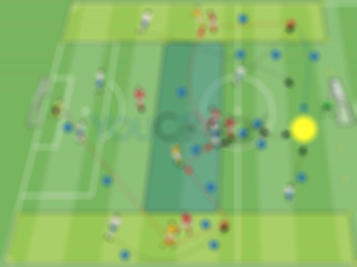 - Se um defesa central da zona 1 se deslocar para uma zona lateral L1 ou L2 para criar uma superioridade numérica, o extremo tem de apoiar o colega de equipa