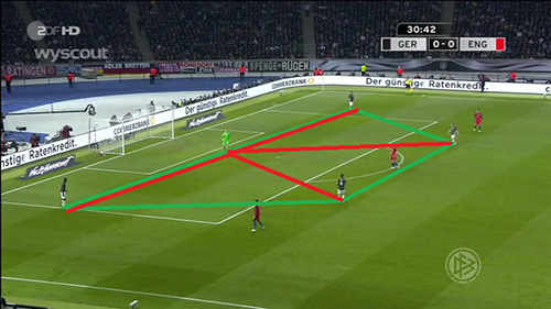 Em caso de pressão, o talentoso guarda-redes alemão tem um excelente passe longo: quando a linha defensiva inglesa sobe, ele chuta diretamente para o fundo.