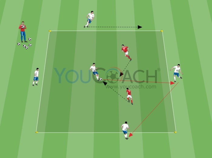 - O jogador de dentro do quadrado será o apoio para os jogadores de fora, terão de evitar os médios e devolver a bola o mais rápido possível.