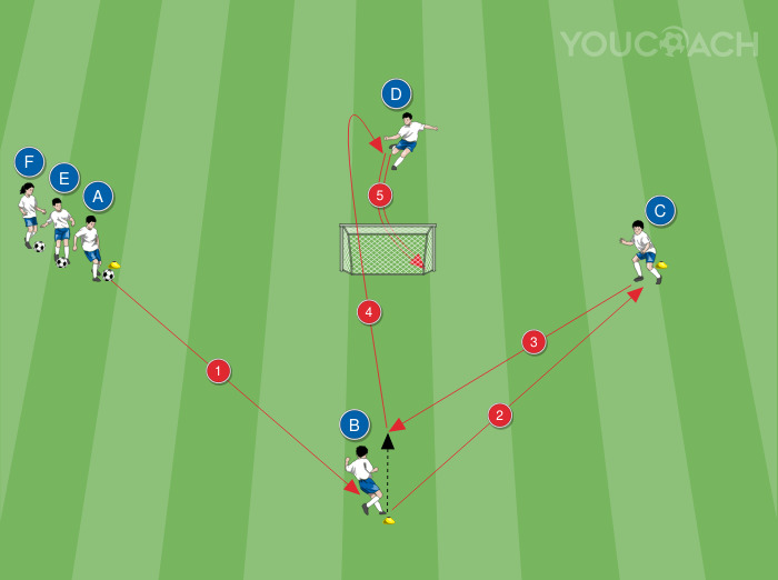 Torschuss - Übung für das Grundlagenalter, die Suche nach dem freien Raum für den Torschuss wird trainiert