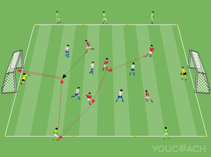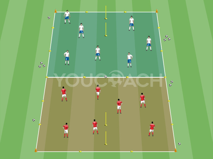 Ballbesitz - Spielform 6 gegen 6 oder 7 gegen 7, die in der Breite entwickelt werden, um die Tiefe zu suchen -
