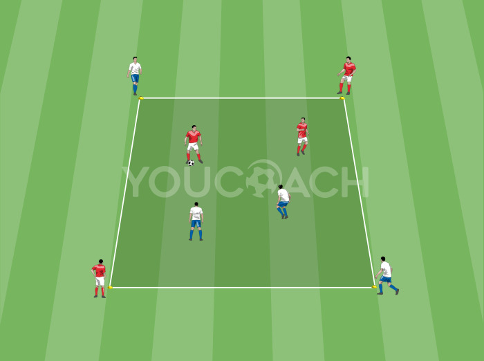 Ballbesitz - Vereinfachte Situation, um junge Spieler im Passspiel, in einem abgegrenzten Raum das Positionsspiel beizubringen -