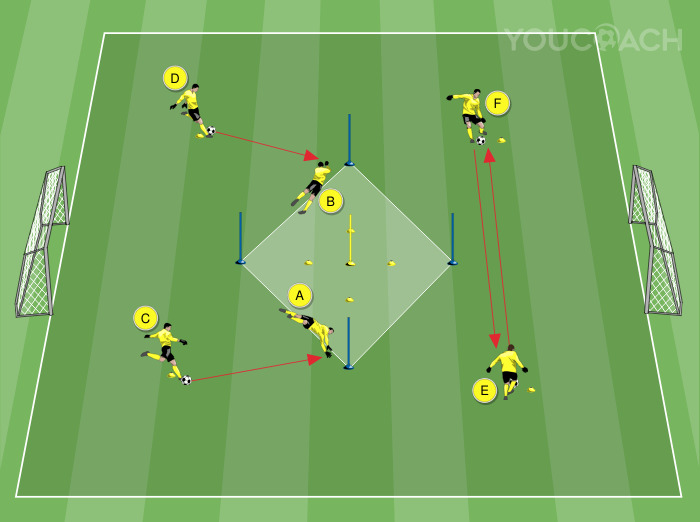Torhüter Technik - Analytische Übung, die verschiedene technische Bewegungen des Torwarts trainiert und anschließend eine 1-gegen-1-Situation simuliert. -