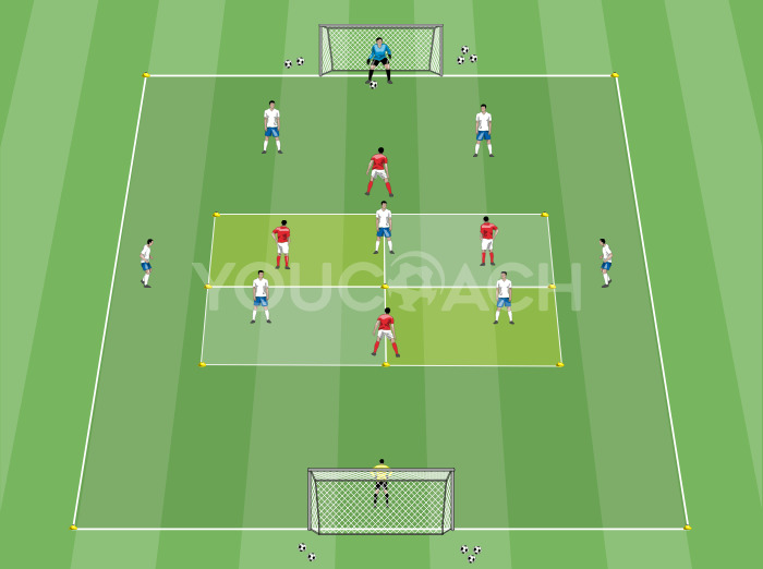Ballbesitz - Spielform 6 gegen 6 oder 7 gegen 7, die in der Breite entwickelt werden, um die Tiefe zu suchen -